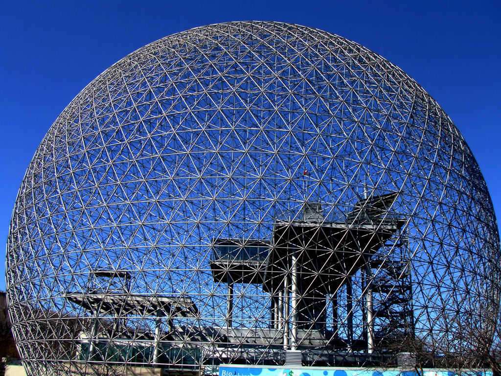 Y hablando de Buckminster Fuller, este fue probablemente su proyecto más conocido: esta gigantesca esfera (76 metros de diámetro y 63 de altura) que albergaba el pabellón de los EEUU en la Exposición Universal de 1967. Su vida desde entonces ha sido azarosa: dañada primero por un incendio y años más tarde por una tormenta de hielo. En la actualidad está ocupada por un Museo del Medio Ambiente l