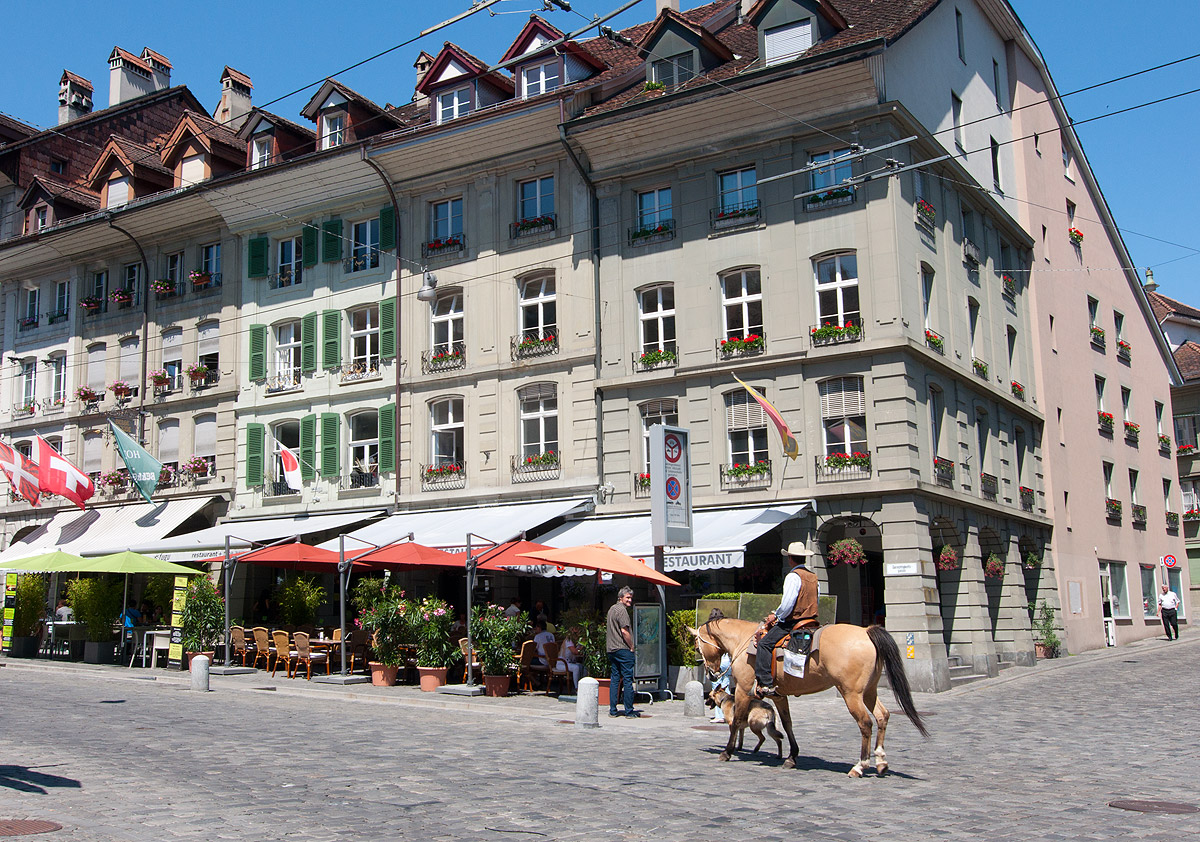Un llamativo paseante que parece salido del Medio Oeste de EEUU, internándose por una de las calles principales del centro histórico de Berna