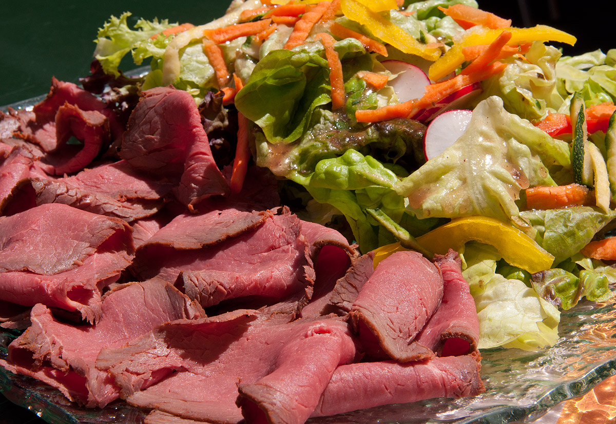 Quizá la cocina suiza no es tan compleja y delicada como la de otros países europeos, pero en sus restaurantes encontramos platos sencillos elaborados de forma sabrosa, apetecible y contundente, como este roast beef acompañado de ensalada