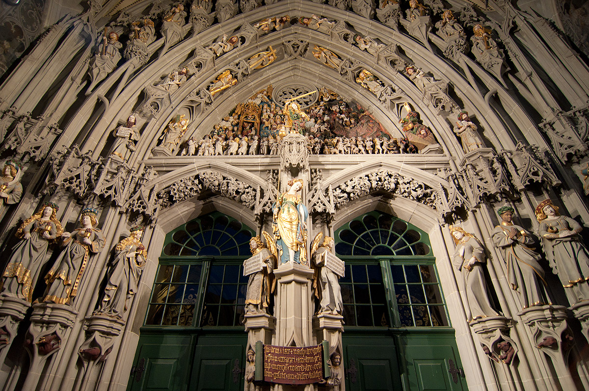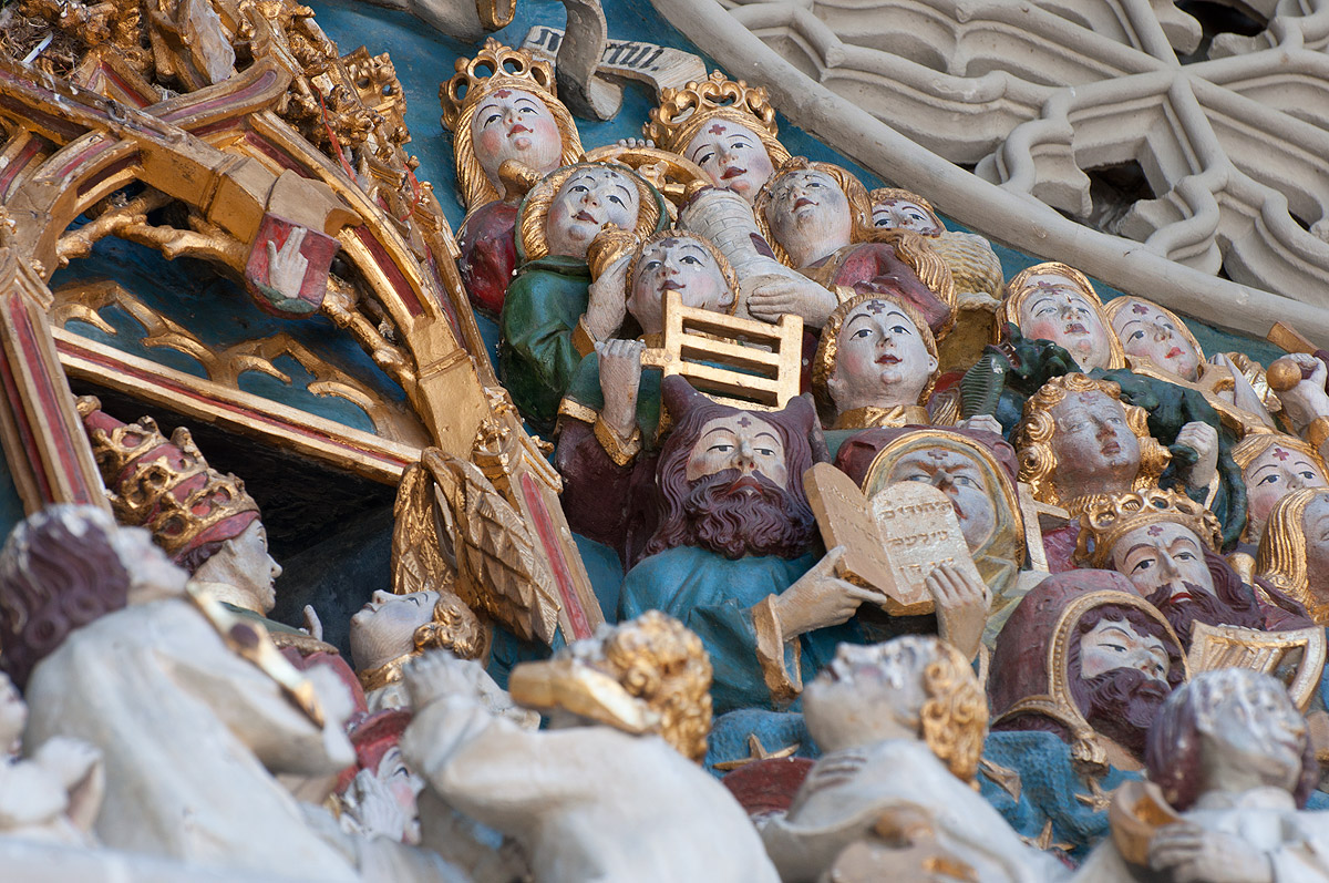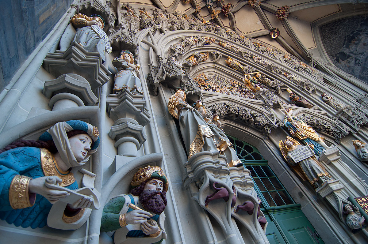 Las esculturas, con un delicado policromado, tienen una apariencia muy realista. Fueron esculpidas por Erhard Küng, que luego fue también maestro de obras del edificio y también representan a personajes bíblicos como la Reina de Saba o el Rey Salomón