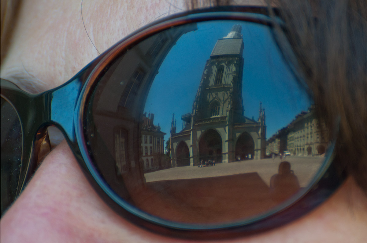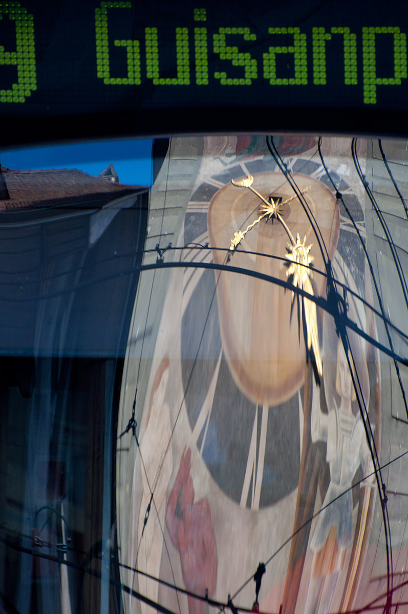 La torre del Zytglogge reflejada en la parte delantera de uno de los modernos y eficaces tranvías que recorren Berna, incluso en su parte más antigua, con puntualidad... suiza