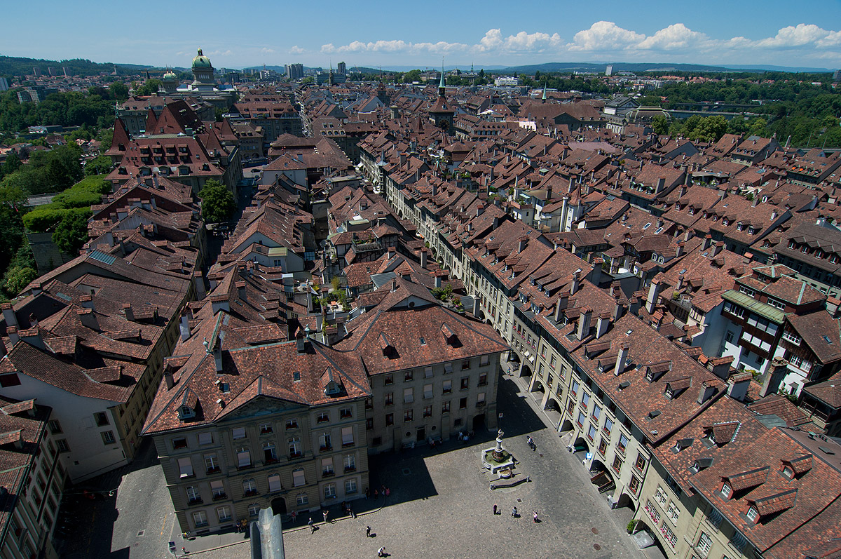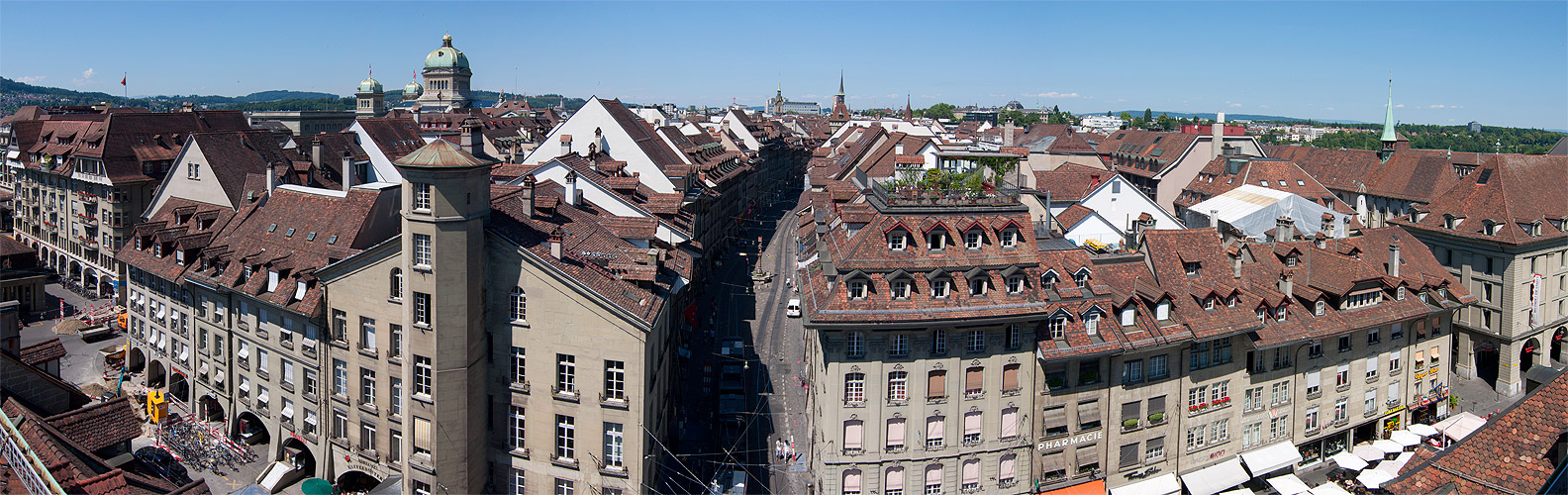 La parte "nueva" de Berna vista en formato panorámico desde lo alto del Zytglogge, que marcaba el límite de la ciudad medieval. Obviamente, esta parte de la ciudad también ha conservado un arquitectura y un interés especiales