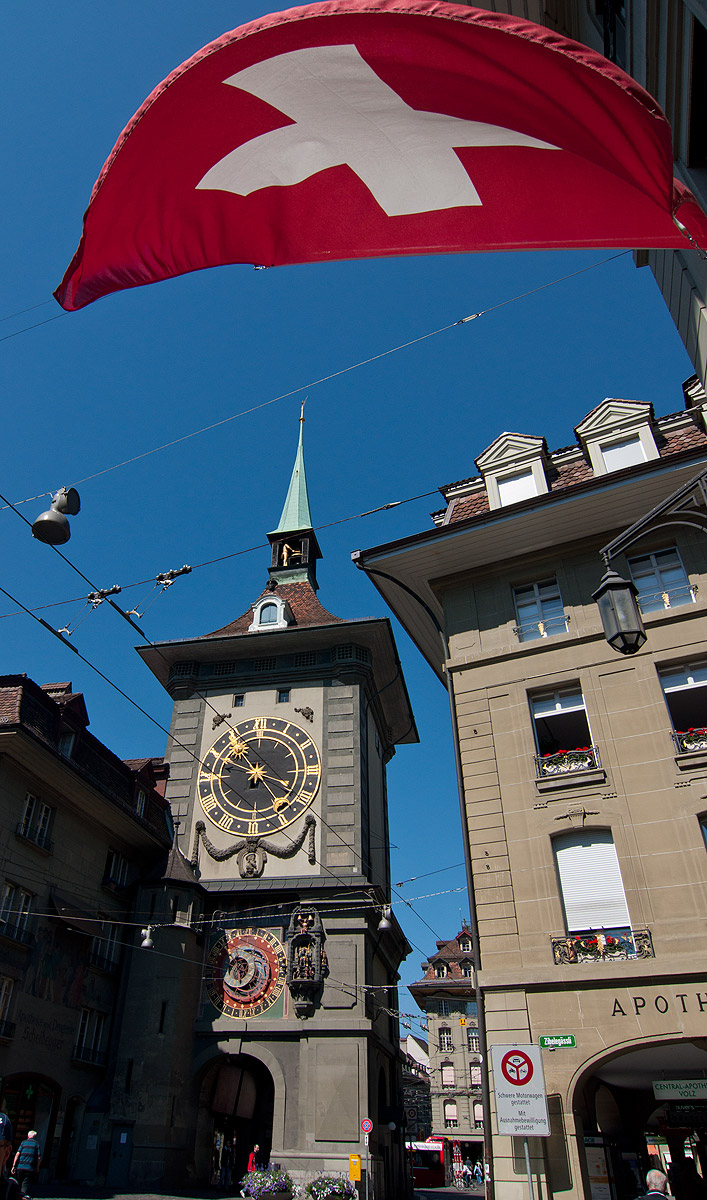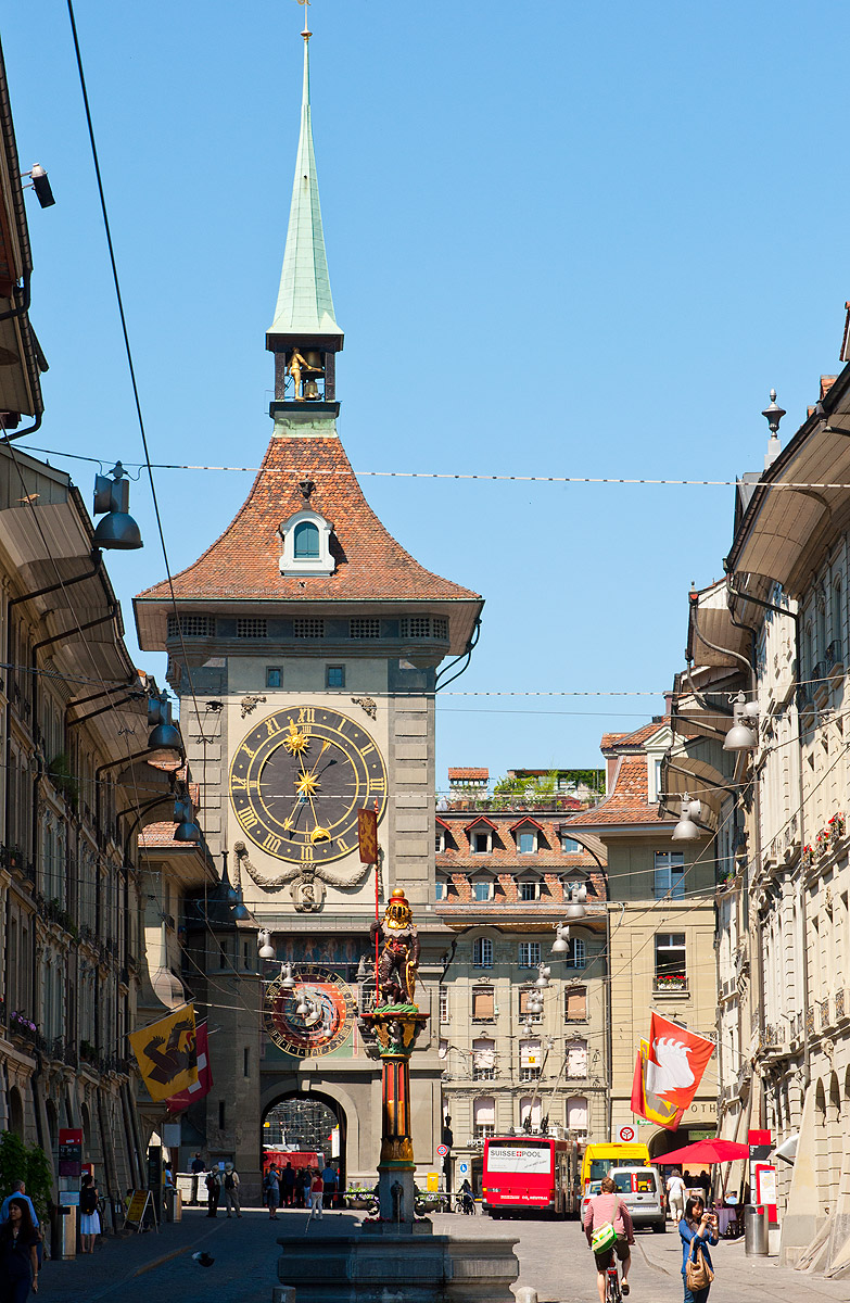 El gran reloj que podemos ver en el Zytglogge es una maravilla de la mecánica del S XVI cuyo mecanismo se mantiene en funcionamiento con un elevadísimo porcentaje de piezas originales. El ingenioso sistema no sólo da las horas e indicaciones astronómicas sino que pone un marcha una serie de figuras que son parte de la tradición de Berna, e incluso hace cantar un gallo