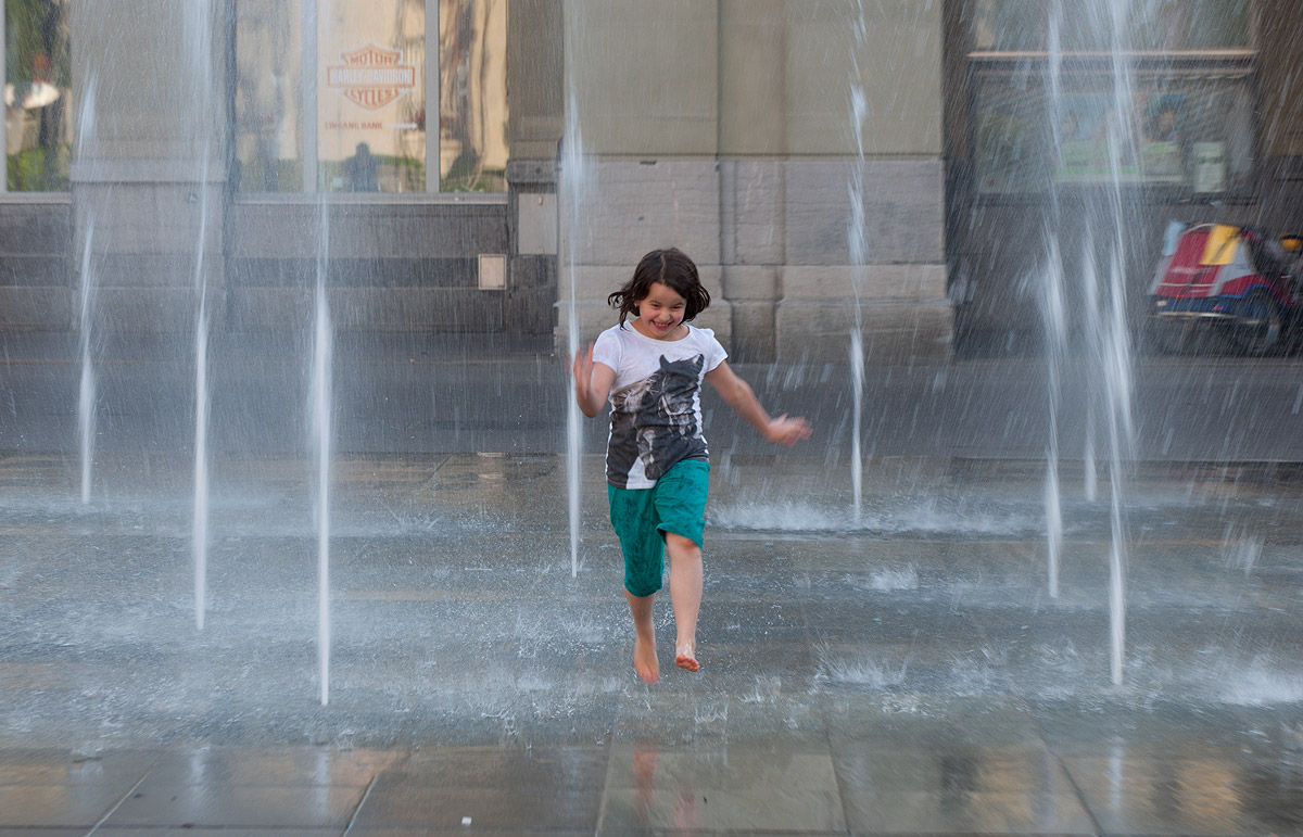 Y en el lado opuesto de la Plaza del Parlamento hay una fuente cuyos chorros salen del suelo en un orden aleatorio que, en los días de buen tiempo, es uno de los sitios preferidos de los niños de Berna