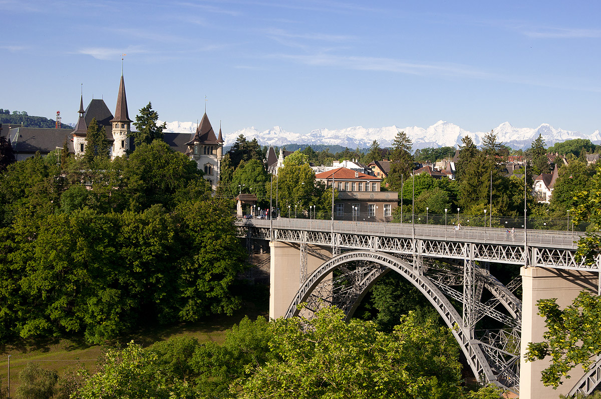 A pesar de que Berna no es una ciudad de montaña los Alpes son, con su imponente y nevada presencia, el telón de fondo sobre el que transcurre y la vida en la ciudad y un elemento tan lejano como imprescindible de su paisaje
