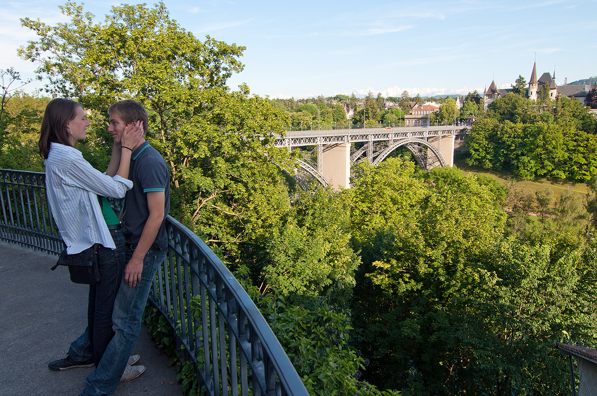 Una pareja feliz en uno de los grandes miradores que la ciudad tiene sobre el curso del Aar, con los Alpes como testigo lejano de su amor