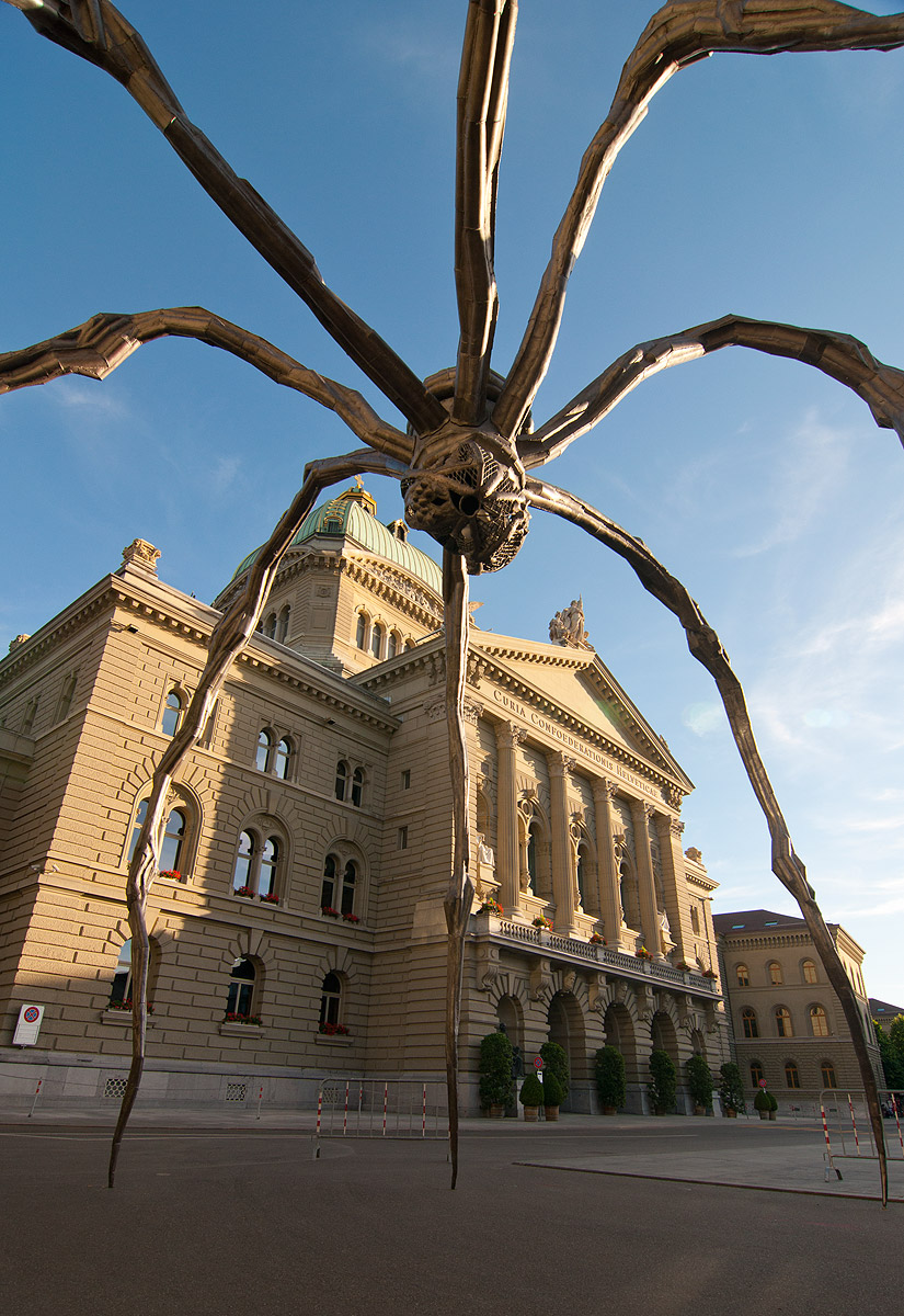 En la plaza del Parlamento está también el Banco Nacional Suizo (la banca central del país) y entre los dos edificios se ha instalado una de las grandes y extrañas arañas de Louise Bourgeois, que supone un extraño contraste con el estilo neoclásico de ambos edificios