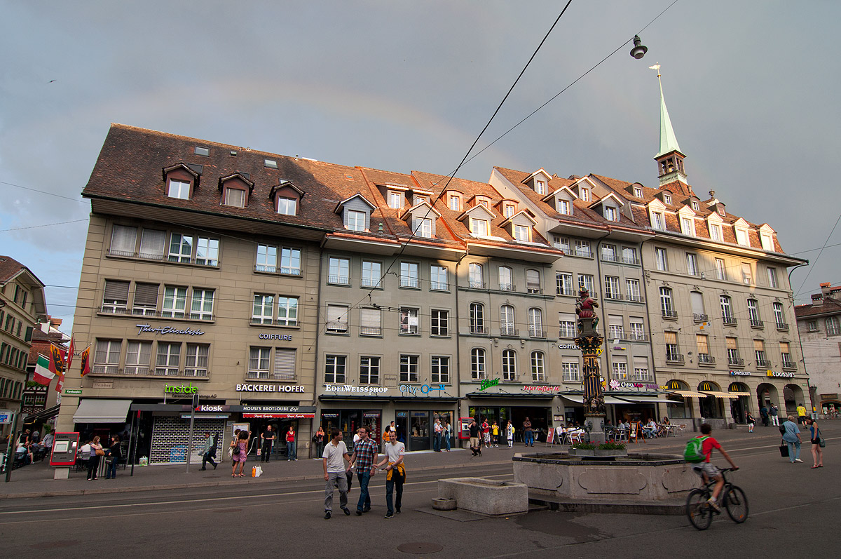 Otra de las plazas del centro de Berna con una de las muchas fuentes (todas con el mismo aspecto: una columna coronada por una estátua y de la que salen cuatro caños) que podemos encontrar en el centro histórico de la ciudad