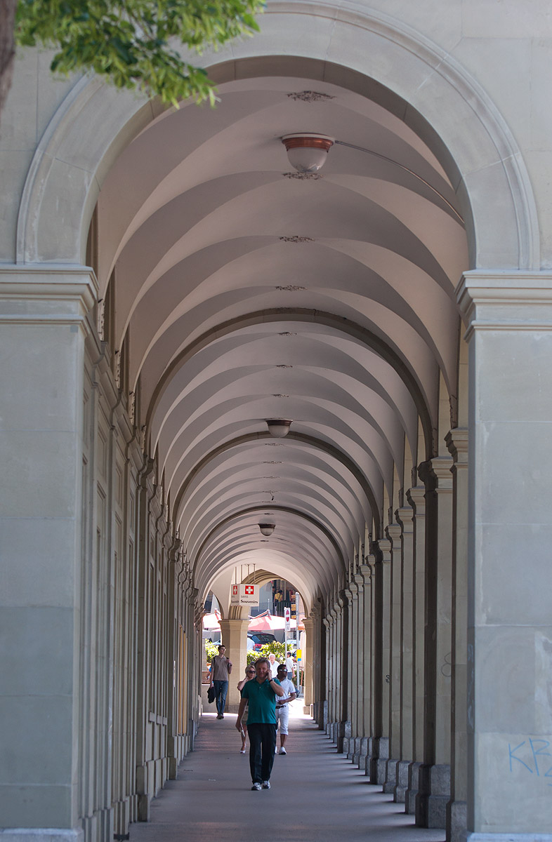 Los soportales son uno de los rasgos distintivos de la ciudad: cuenta con casi seis kilómetros de ellos y allí, protegidos de las inclemencias del clima, se agolpan los comercios de primera fila, los restaurantes y las cafeterías en los que los berneses desarrollan buena parte de sus vida social
