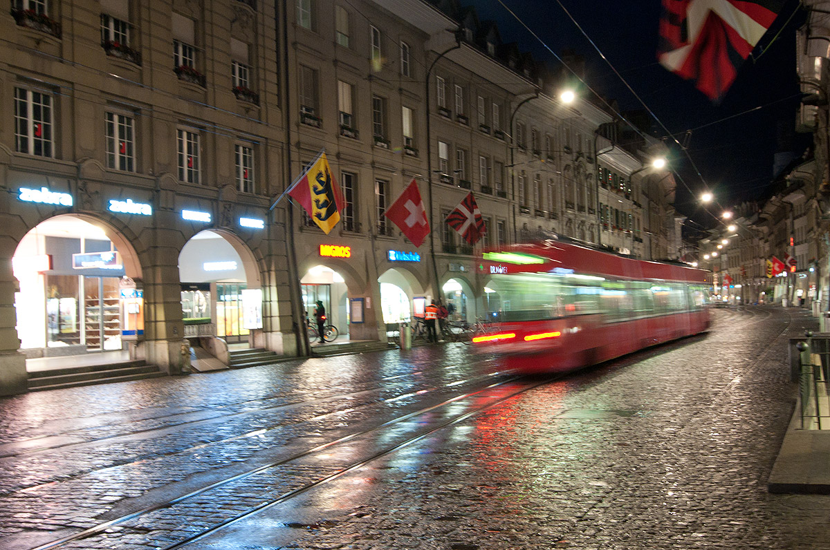 Un típica calle del centro de Berna, con sus soportales y, de nuevo, uno de los tranvías que circulan por toda la ciudad
