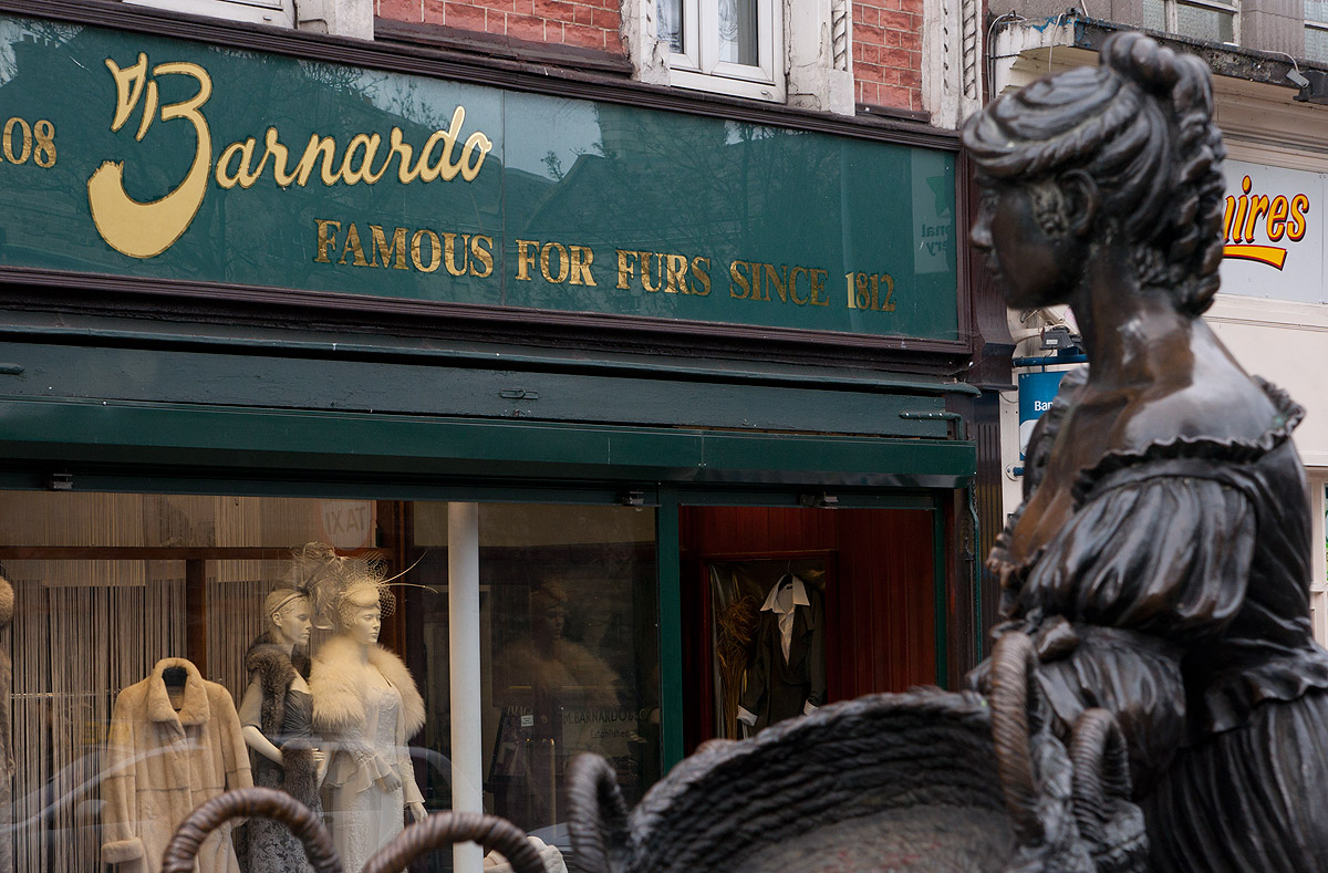 Molly Malone parece mirar el escaparate de una peletería. La estatua del famoso personaje es punto ineludible para los turistas y motivo de bromas por su generosísimo escote