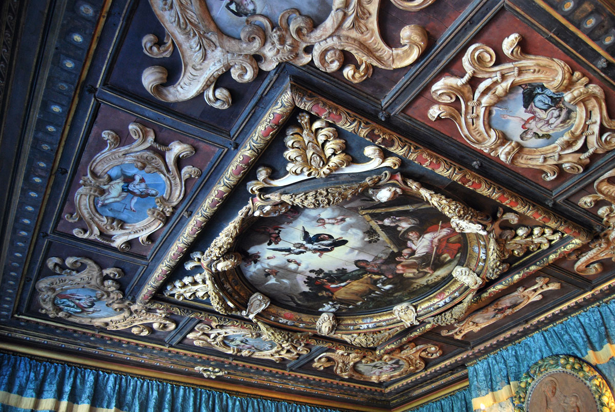 El techo de una de las salas de la casa, decorado con frescos muy ornamentados.