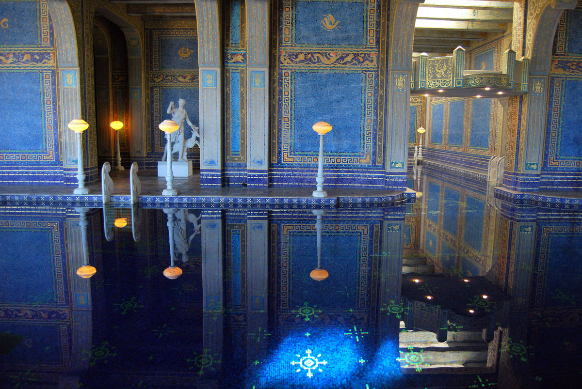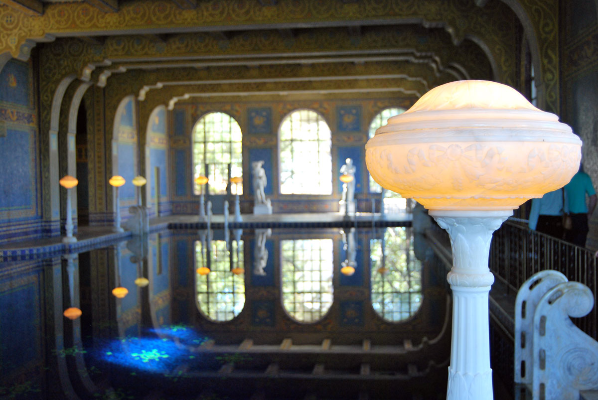 Una lámpara eléctrica ayuda a iluminar la piscina Romana del interior del Castillo Hearst.