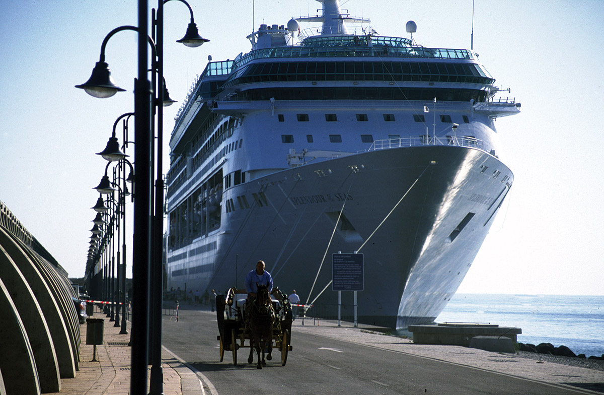 Un crucero en el puerto y un coche de caballos, turismo de ayer y de hoy
