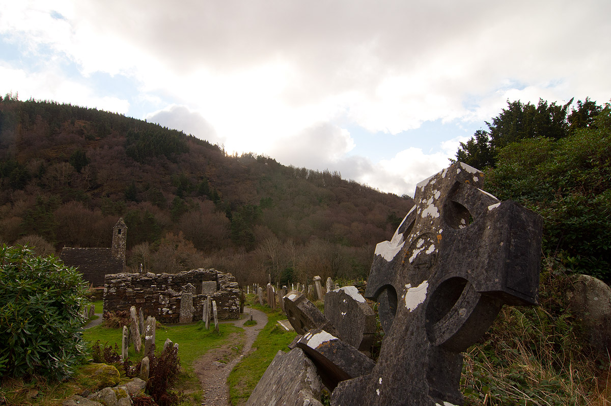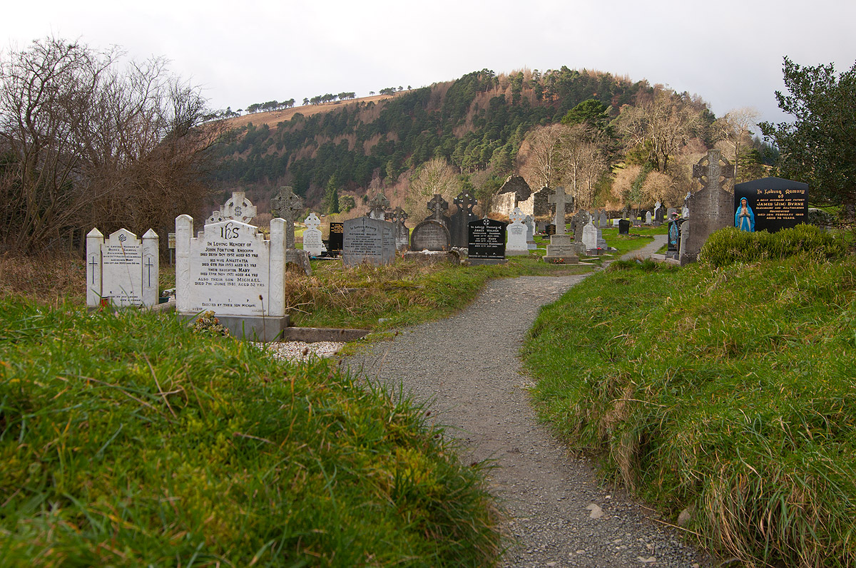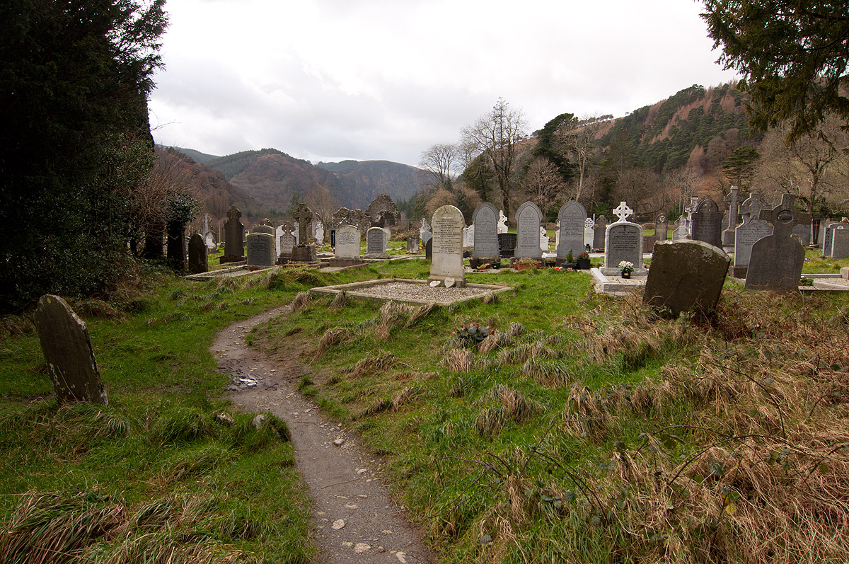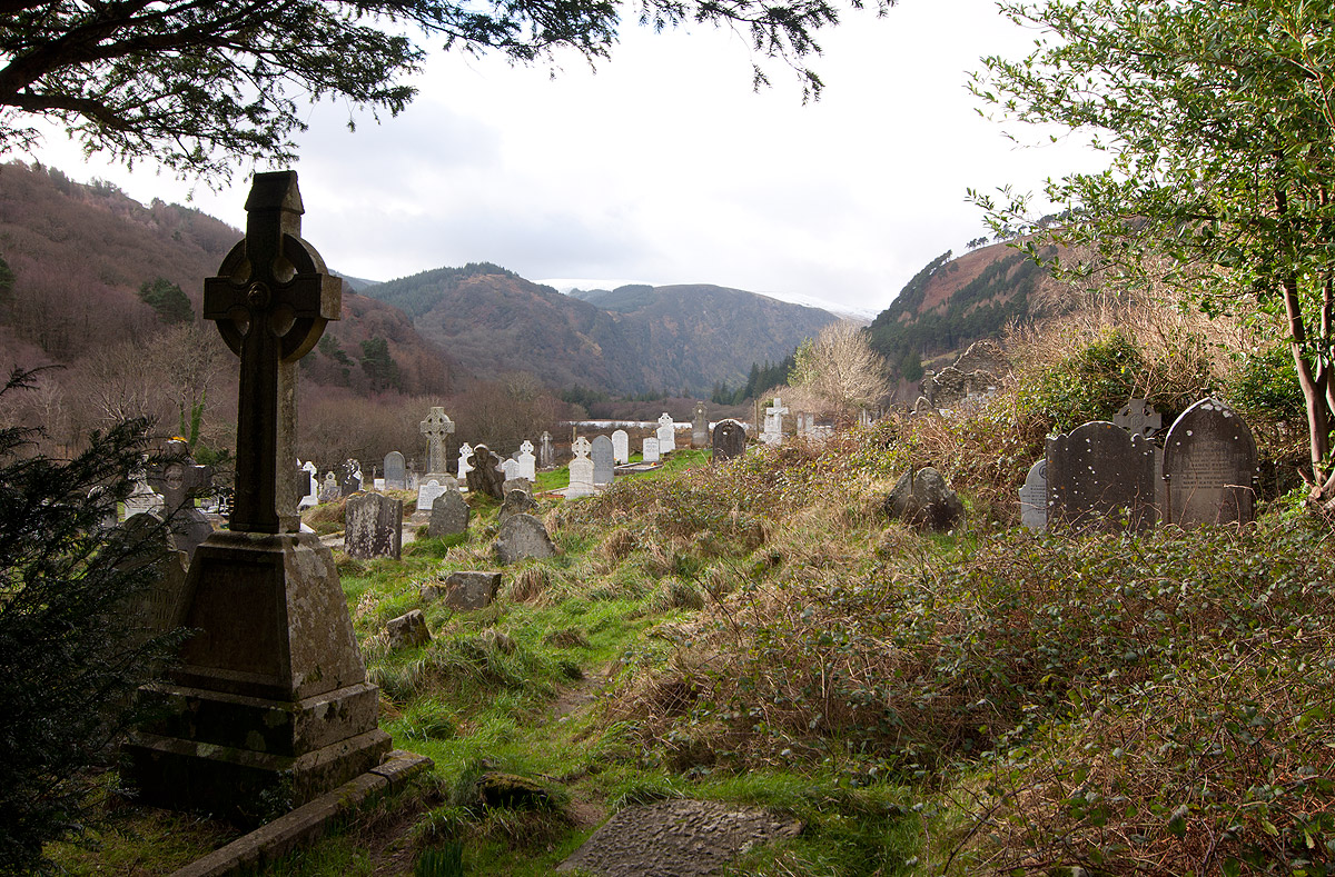 Otro rincón del cementerio con el lago y las montañas Wicklow como telón de fondo