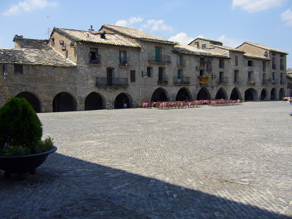 De enormes proporciones para el tamaño del pueblo, la de Ainsa es una de las plazas mayores medievales más hermosas y mejor conservadas de España. Nació como plaza del mercado y las estrechas casas que la conforman con diferentes tamaños y diseños (aunque esto no evita que el conjunto sea armónico) revelan que se desarrolló sin un plan urbanístico preciso preconcebido