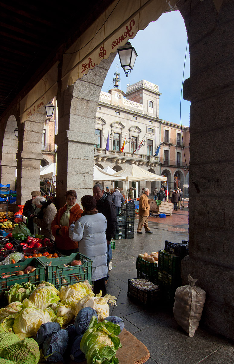 En no pocas ocasiones las plazas mayores que podemos admirar hoy en día son el resultado de construir una nueva donde la vieja estaba ya desmoronándose. Es el caso de la de Ávila, también llamada del Mercado chico y que es una obra de finales del XVIII de un discípulo de Ventura Rodríguez. Como ven en la imagen, todavía hoy se celebra en ella el mercado
