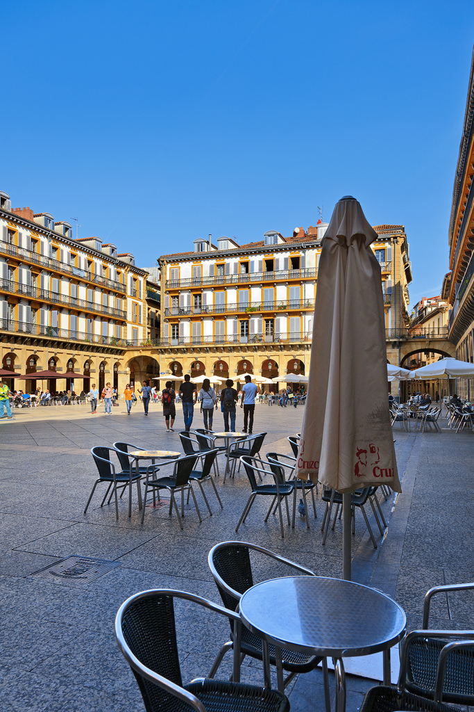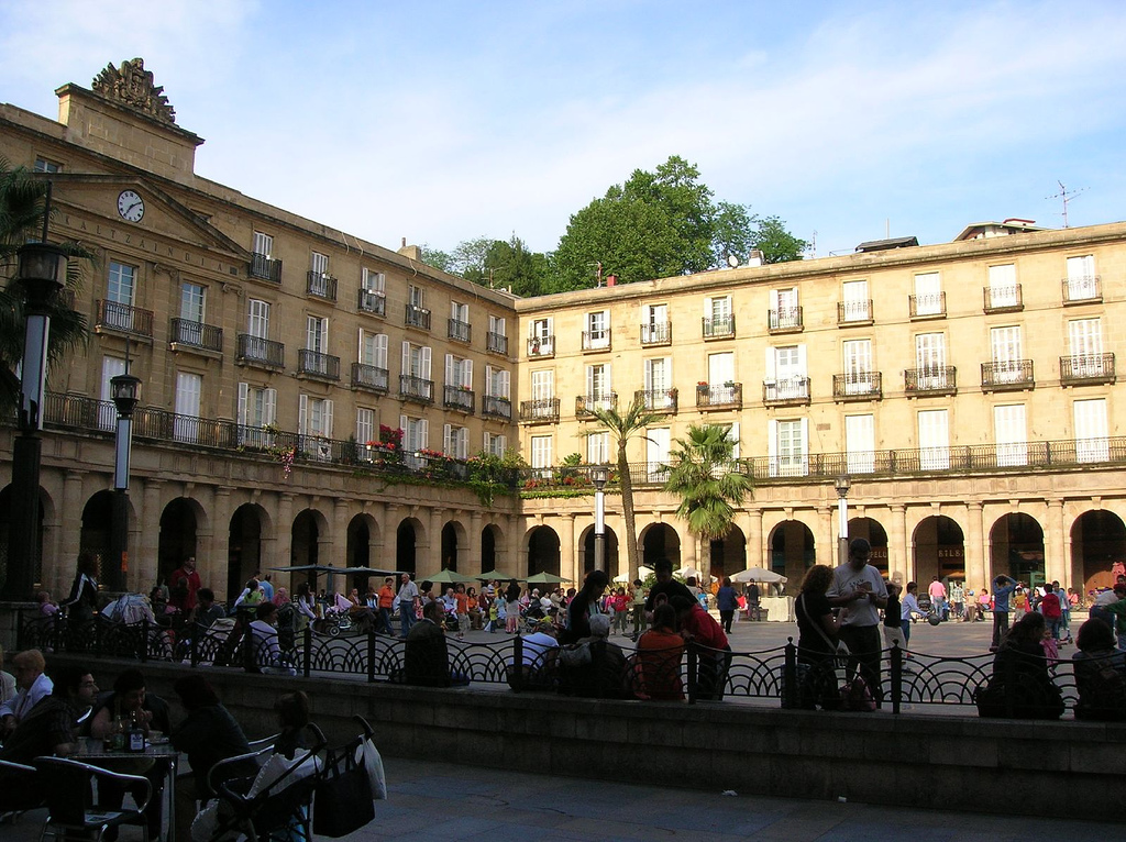 Como la cercana de Bilbao, la plaza de la Constitución de San Sebastián es un proyecto ya tardío, de pleno S XIX, provocado como en otras ocasiones por un incendio, en este caso el que devastó la ciudad en 1813. Usada como plaza de toros, las ventanas todavía muestran los números que correspondían a su ordenación de cara a celebrar espectáculos taurinos. Ya sin toros, sigue siendo uno de los epicentros de la vida ciudadana
