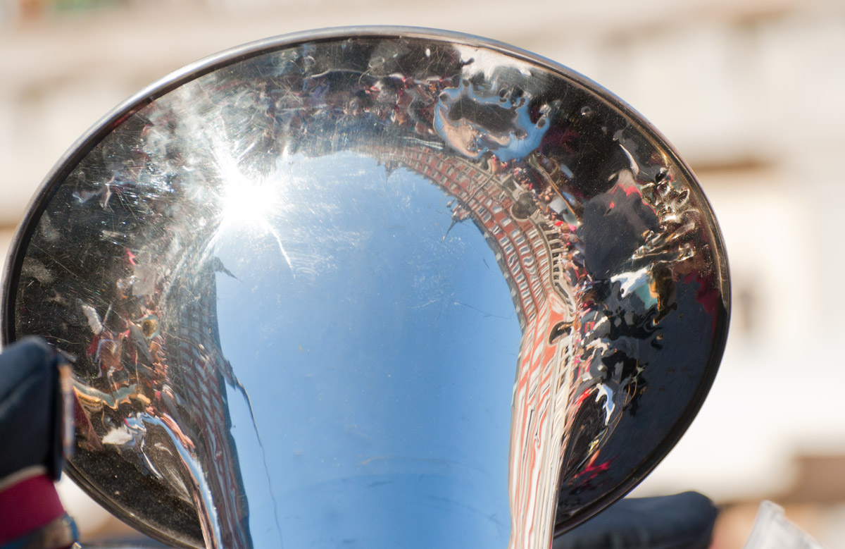 La de Madrid es probablemente el modelo que siguieron muchas de las plazas mayores que posteriormente se fueron planificando por toda España. Se construyó a principios del S XVII según los planos de Juán Gómez de Mora. Su aspecto actual se lo debemos también a Juan de Villanueva, que sobre todo la cerró construyendo los arcos sobre las calles de entrada. En la imagen la vemos reflejada en la campana de una tuba, durante una procesión de San Isidro
