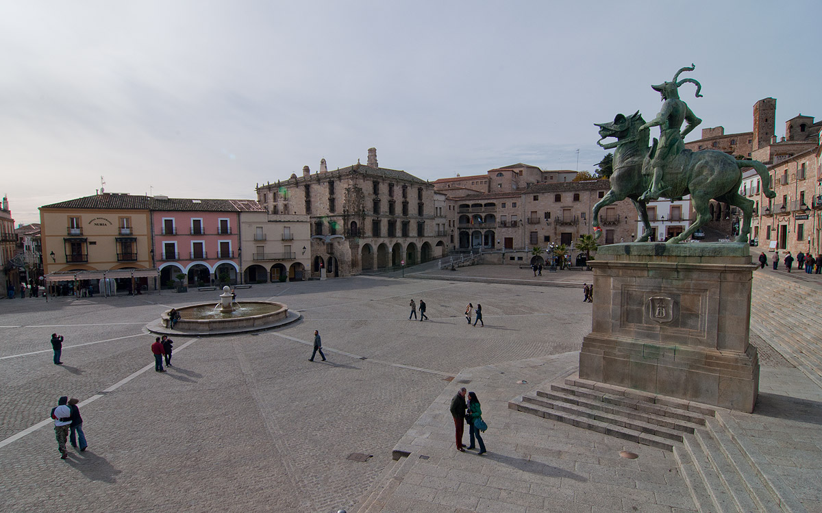 La de Trujillo es otra de las plazas mayores más conocidas de España y también de las más bellas. Llaman la atención en ella los distintos niveles separados por rampas y escaleras que no suelen ser habituales. Presidiendo la plaza y convertida en un elemento icónico, la estatua del conquistador del Perú, Francisco Pizarro