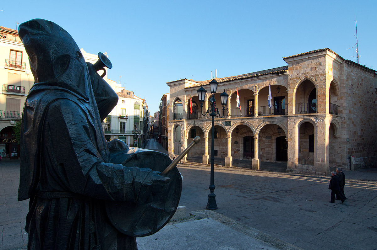 La Plaza Mayor de Zamora es un peculiar espacio urbano en el que se enfrentan dos ayuntamientos: el viejo (en la imagen) y el nuevo ubicado justo enfrente. Además, llama la atención que buena parte del espacio está ocupado por la iglesia de San Juan de la Puerta Nueva, junto a la cual está la estatua de uno de los personajes más populares de la Semana Santa zamorana, el Mumbrú, que también podemos ver la imagen