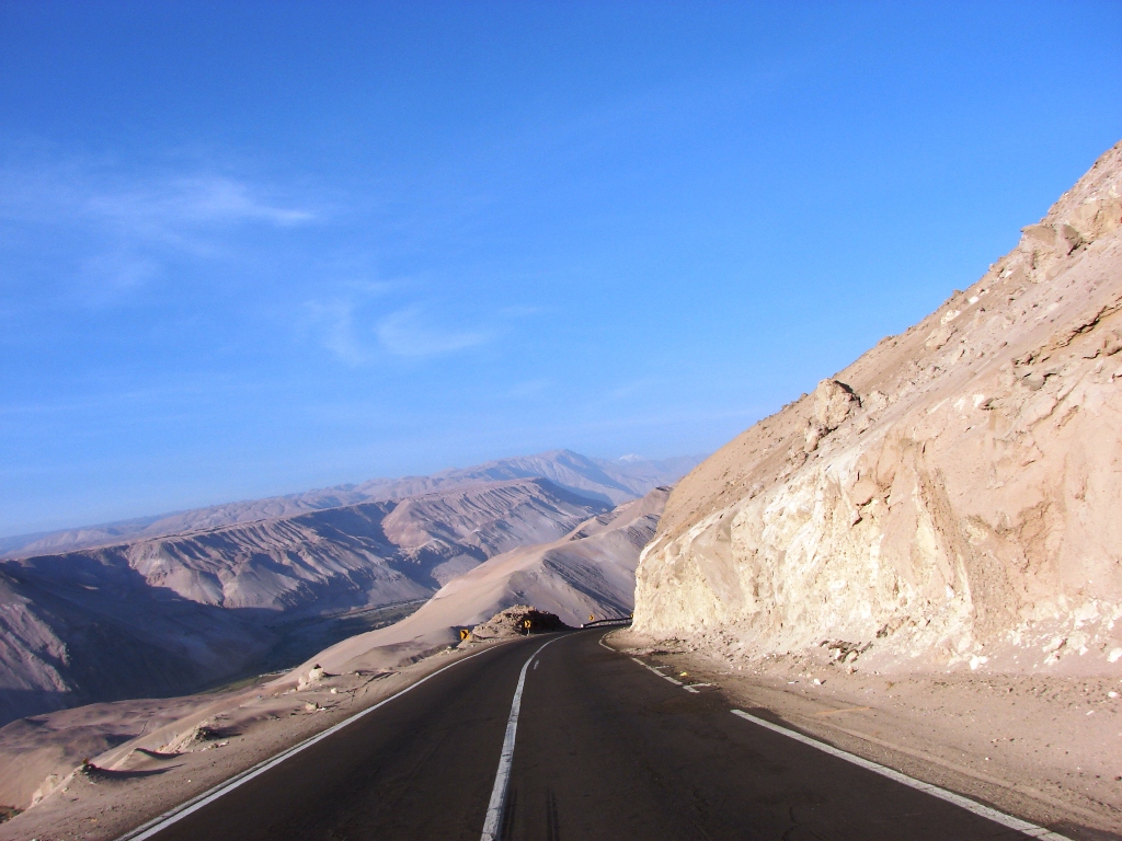 El desierto de Atacama es el más seco del mundo. Hay zonas donde lleva sin llover desde el siglo XVI. Aunque se extiende por otros países, la parte central le corresponde a Chile. Una carretera nacional, la Ruta nº 5, que forma parte de la famosa Panamericana, cruza el desierto de norte a sur, con gasolineras cada 200 kilómetros.