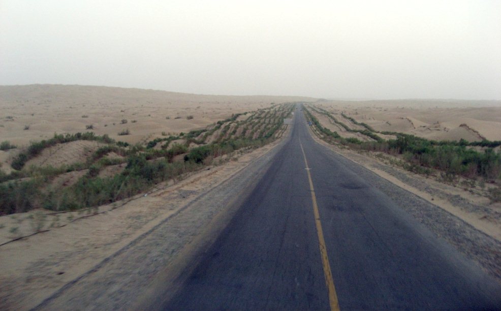 Los chinos construyeron esta carretera de 550 kilómetros de longitud para comunicar las instalaciones petrolíferos del desierto de Talklamakán con la civilización. Para evitar que las dunas hicieran desaparecer la carretera la rodearon de plantas. A mitad de recorrido hay una estación de servicio con gasolinera y un par de restaurantes. Entre medias, sólo las casas azules de los encargados del mantenimiento de la línea verde que separa el asfalto de la arena. Nada más.