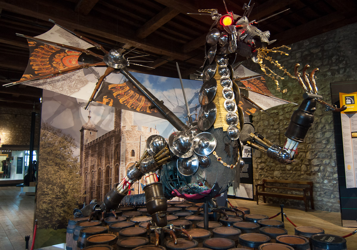 Un dragón hecho con diversas zonas metálicas y armas llama poderosamente la atención de los pequeños
