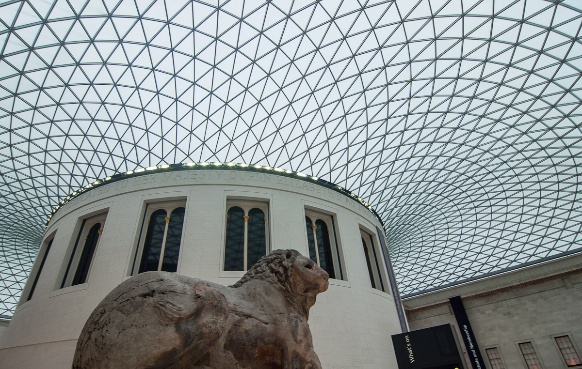 El espectacular Gran Atrio de Isabel II del Museo Británico, con una cubierta de cristal diseñada por Norman Foster, un espacio estupendo para descansar e incluso corretear un poco
