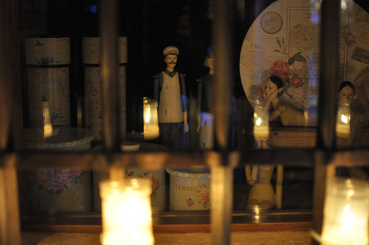El escaparate de un establecimiento se transforma la noche de las velas en Pedraza.