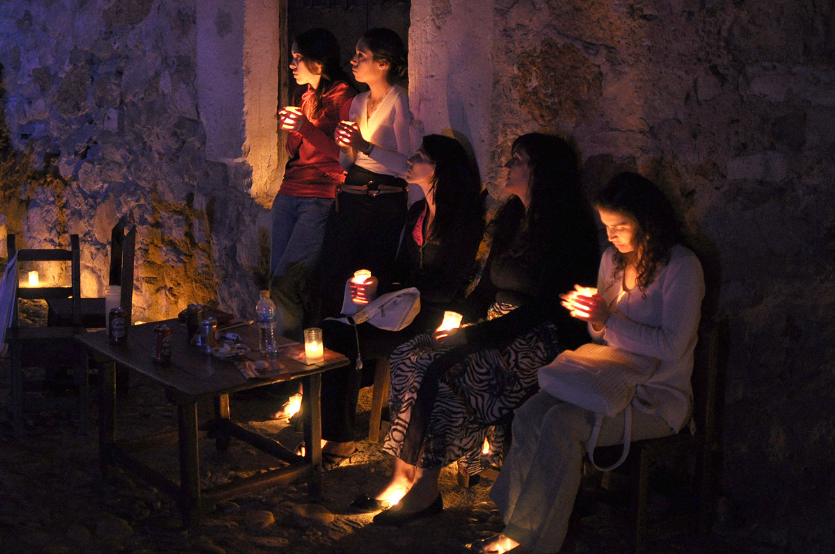Un grupo de amigas mantienen una conversación divertida a la luz de varias pequeñas velas.