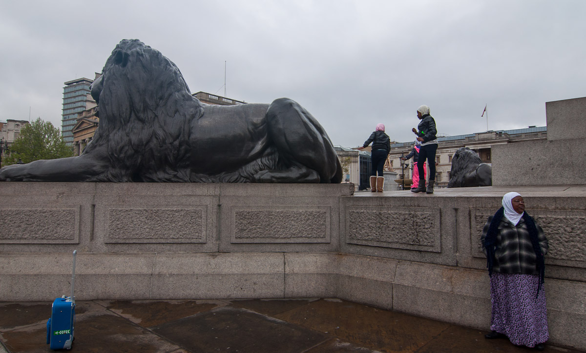 Los niños de una familia de procedencia africana juegan junto a uno de los cuatro imponentes leones de bronce del monumento a Nelson en Trafalgar Square