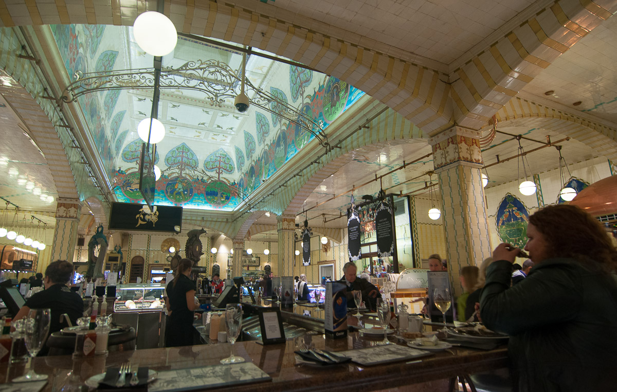 Para el turista medio, pasear por el interior de Harrod's es la mejor aproximación al lujo, al menos físicamente estaremos al lado de él. En la imagen el espectacular Oyster Bar, culmen de una zona dedicada a la gastronomía en la que a uno se le cae la baba... y se le encoge la cartera