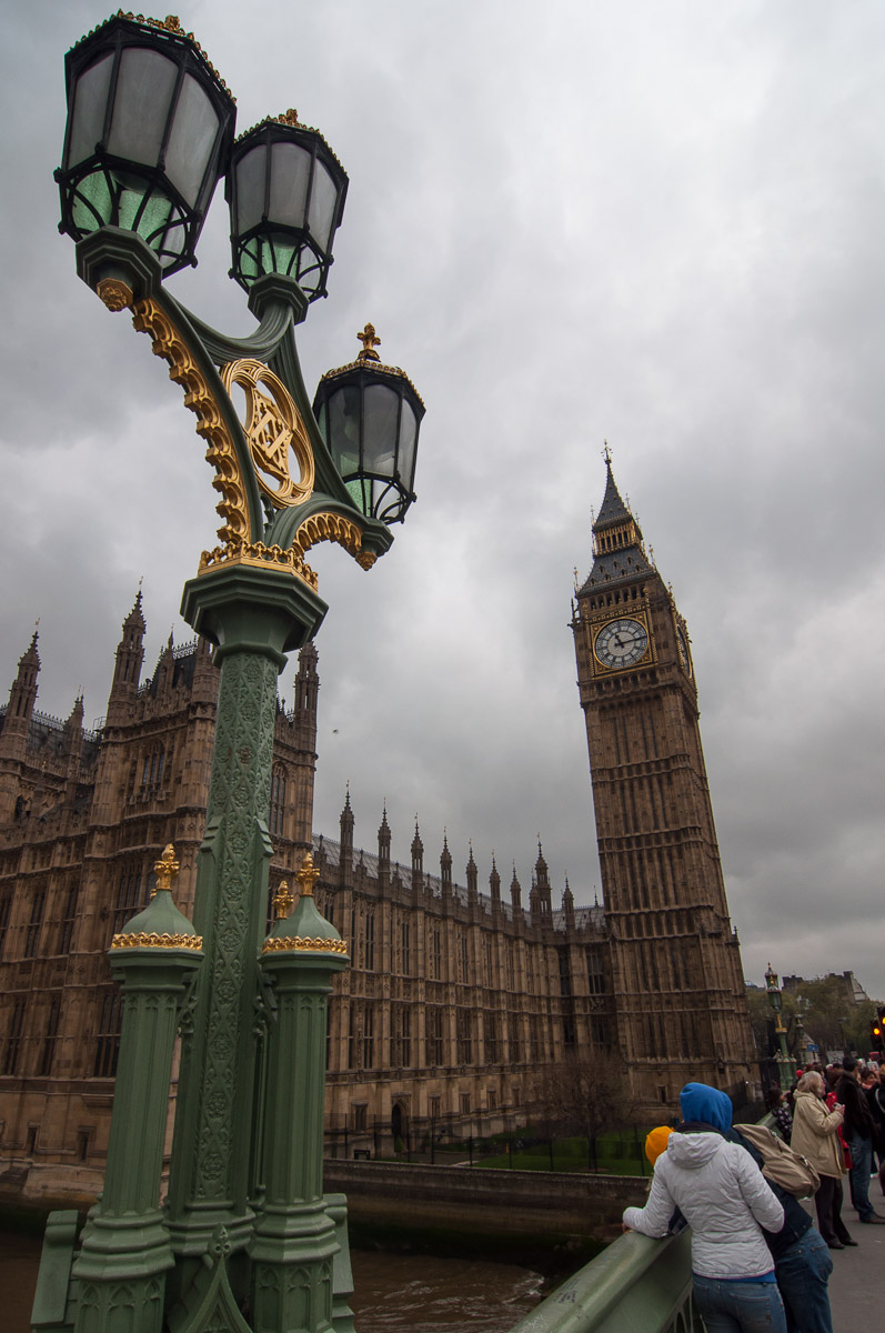Uno de los símbolos más reconocibles de Londres es esta torre junto al edificio del Parlamento. Un conjunto impresionante y bellísimo de ese estilo neogótico que tanto gusta a los ingleses. En la imagen, con una de las historiadas farolas de Westminster Bridge