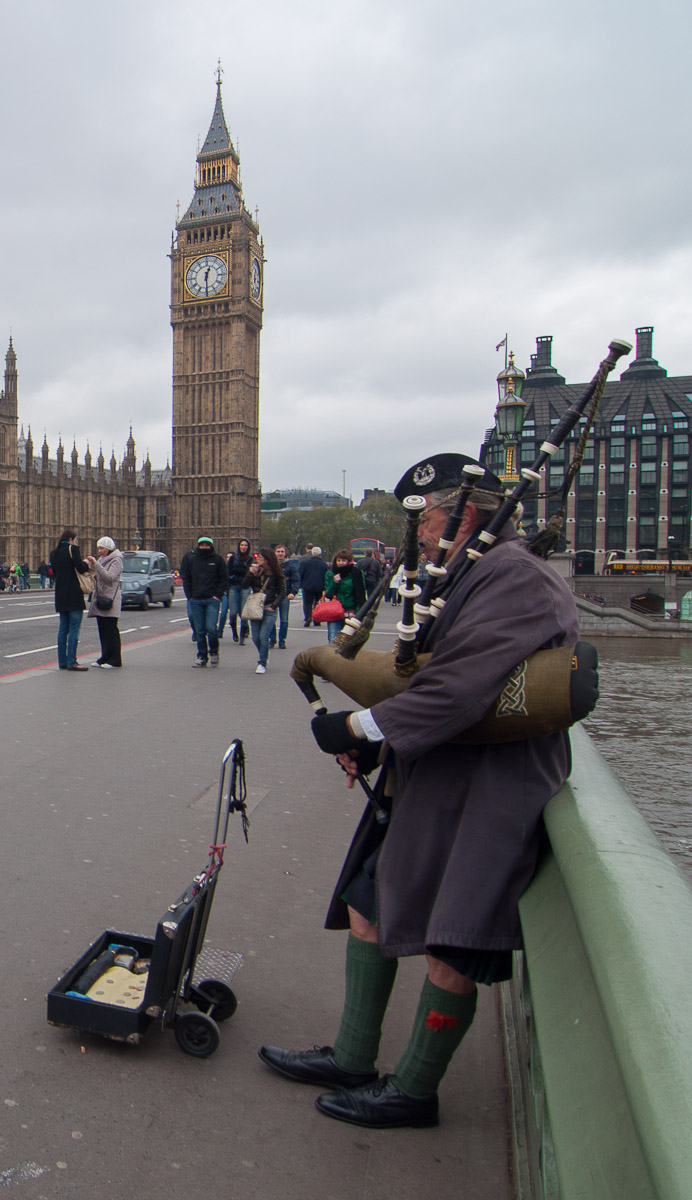 Un músico callejero toca la gaita apoyado en la barandilla del Westminster Bridge y hace que la escena no pueda ser más típica