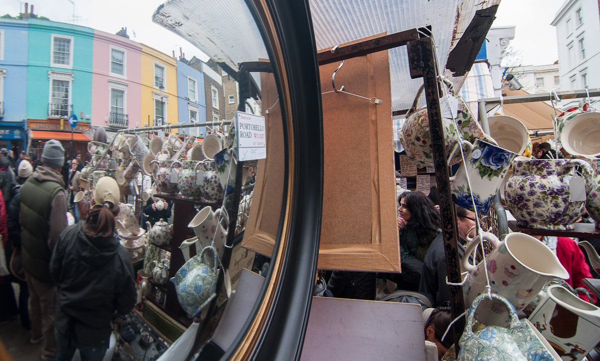 Un rincón de Portobello reflejado en un espejo en una tienda de imposibles tazas y teteras