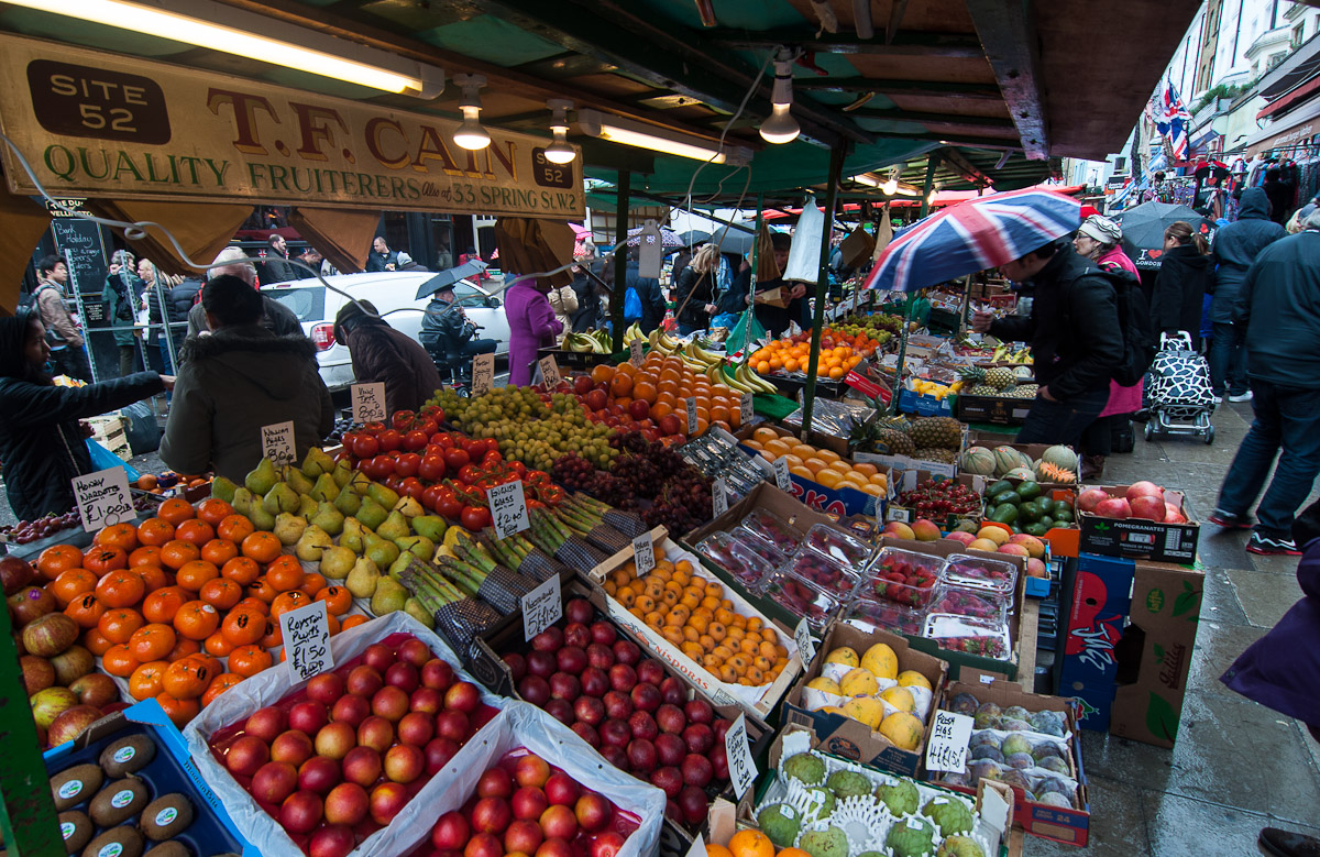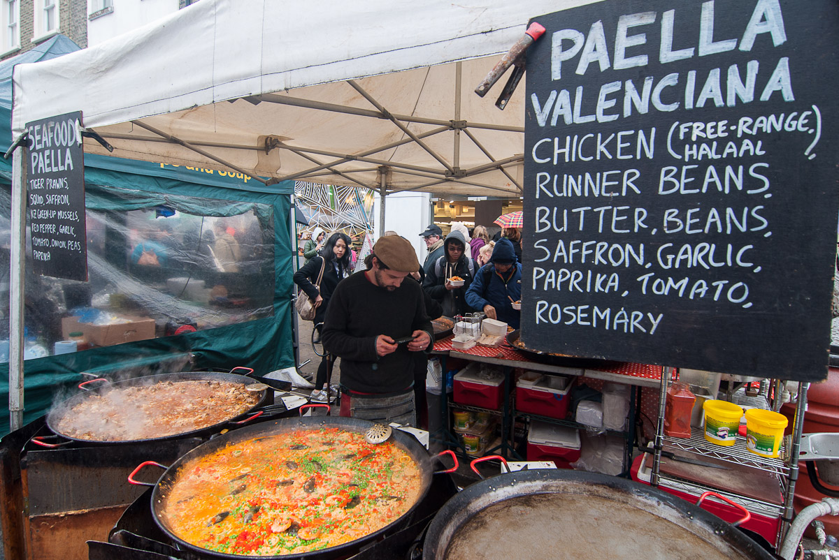 En los puestos de Portobello se pueden encontrar tanto materias primas como platos ya acabados, algunos tan sorprendentes como este puesto de paellas que era propiedad de uno jóvenes emigrantes emprendedores