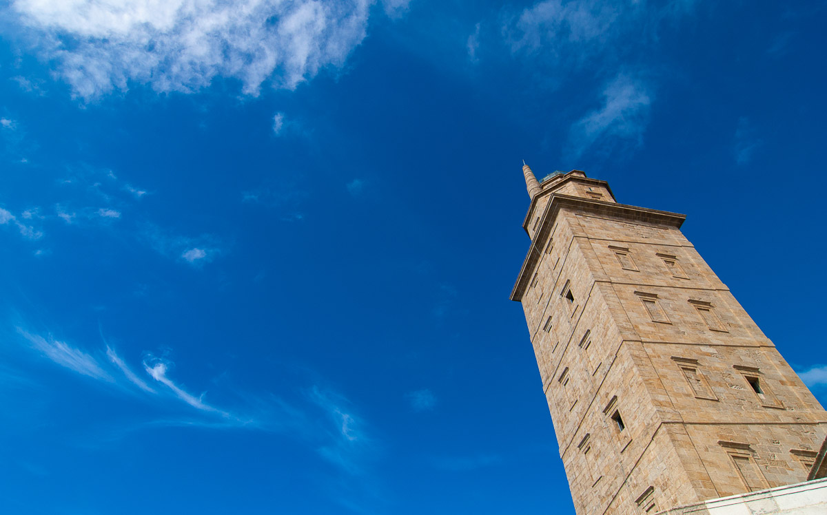 La Torre de Hércules, apuntando a un cielo de un intenso color azul