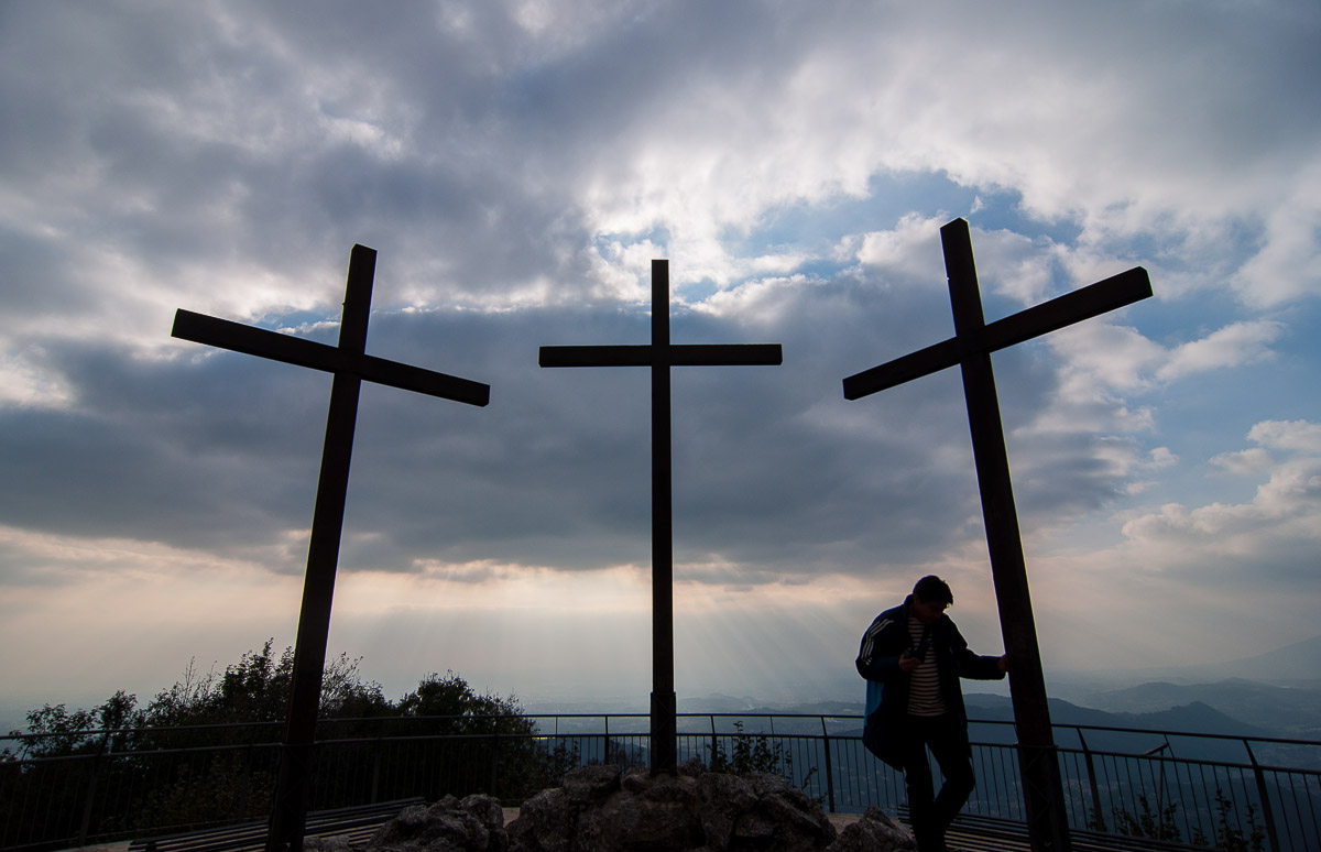 Tres cruces que se alzan junto al Faro de Volta, un monumento peculiar dedicado a Alessandro Volta, natural de Como, desde el que hay unas vistas maravillosas del Lago Como