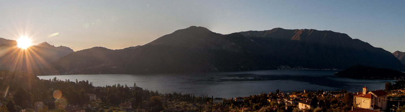 El sol sale por entre las altas montañas y empieza a iluminar las localidades en las orillas del lago
