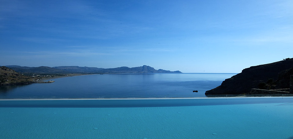 Más islas griegas de ensueño para nuestra lista, ahora Rodas, y también piscinas infinitas que, no sabríamos muy bien decir por qué, se han convertido en un complemento casi imprescindible del romanticismo. Grecia en primera clase, en suma