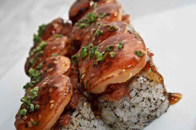 De ésta salen elaboraciones como el Tataki de ventresca de atún; el Nigiri de foie con kanten de mango caramelizado, las Gyozas caseras de carabineros... Y otras propuestas tan divertidas como el Bocata de Calamares (Futomaki con Mamenori) o el Gunkanmaki de yema pochada con crujiente de lentejas, jamón ibérico y perlas de trufas, que recuerda a los huevos fritos con patatas.