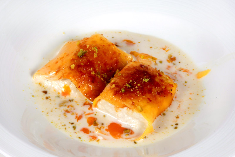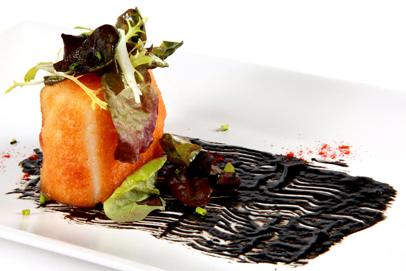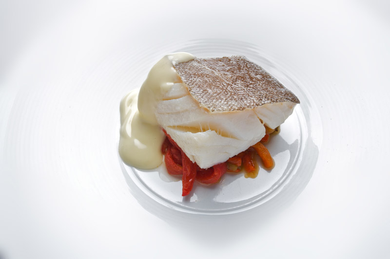 omo de Bacalao Confitado con Pisto de Aceitunas y Pan Crujiente
