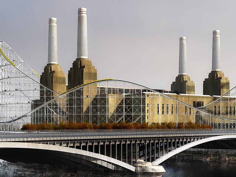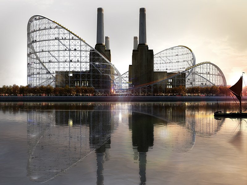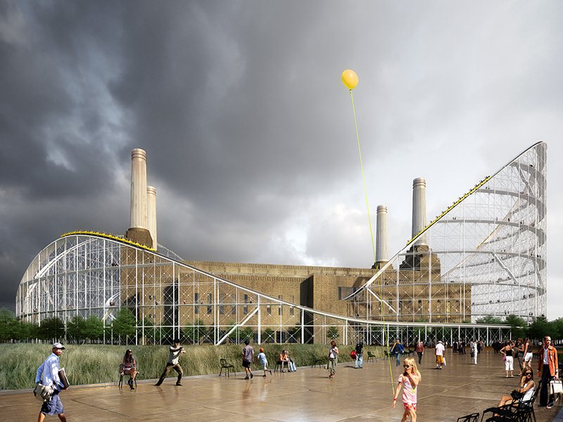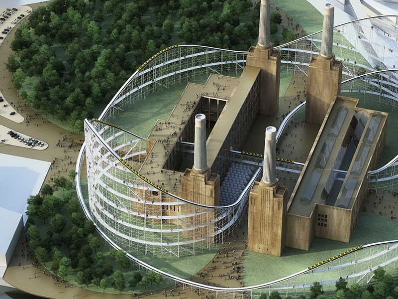 Quizá el edificio industrial más famoso del mundo, la central eléctrica abandonada de Battersea, en Londres, está a la venta. Un estudio de arquitectura ha propuesto convertirla en una montaña rusa. | Atellier Zündel Cristea