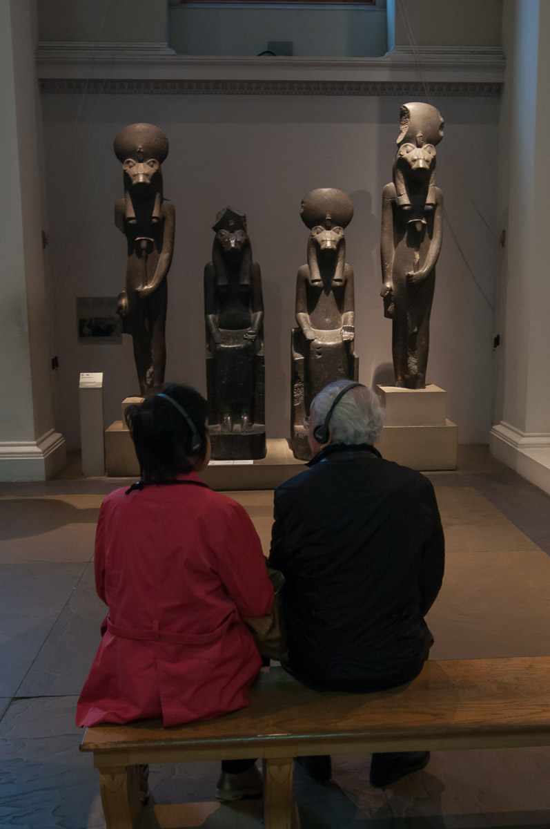 Dos visitantes contemplan un espléndido grupo de estatuas egipcias