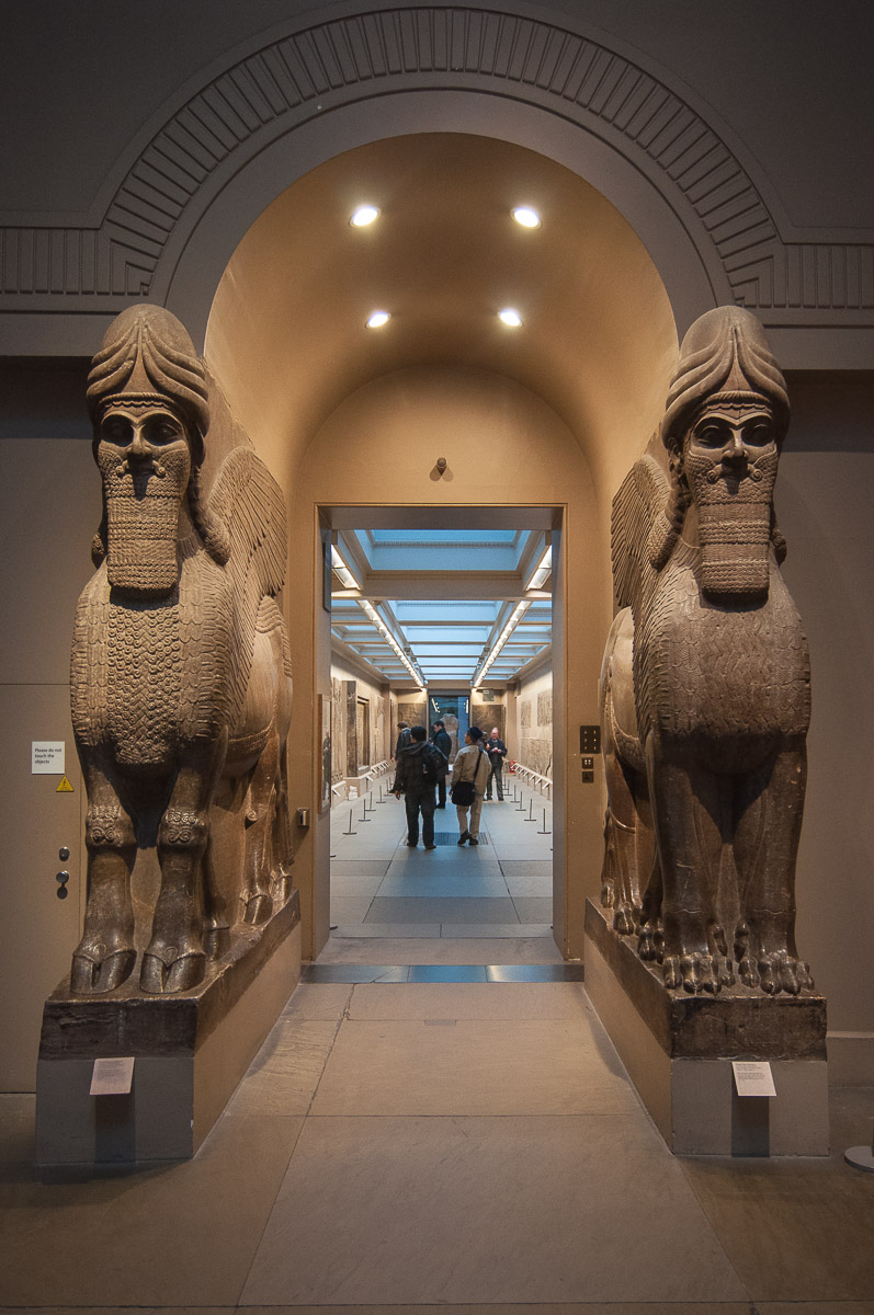 Dos estatuas asirias representando a sendos Lammasu, seres mitológicos que tenían cabeza de hombre, alas de águila y cuerpo de toro