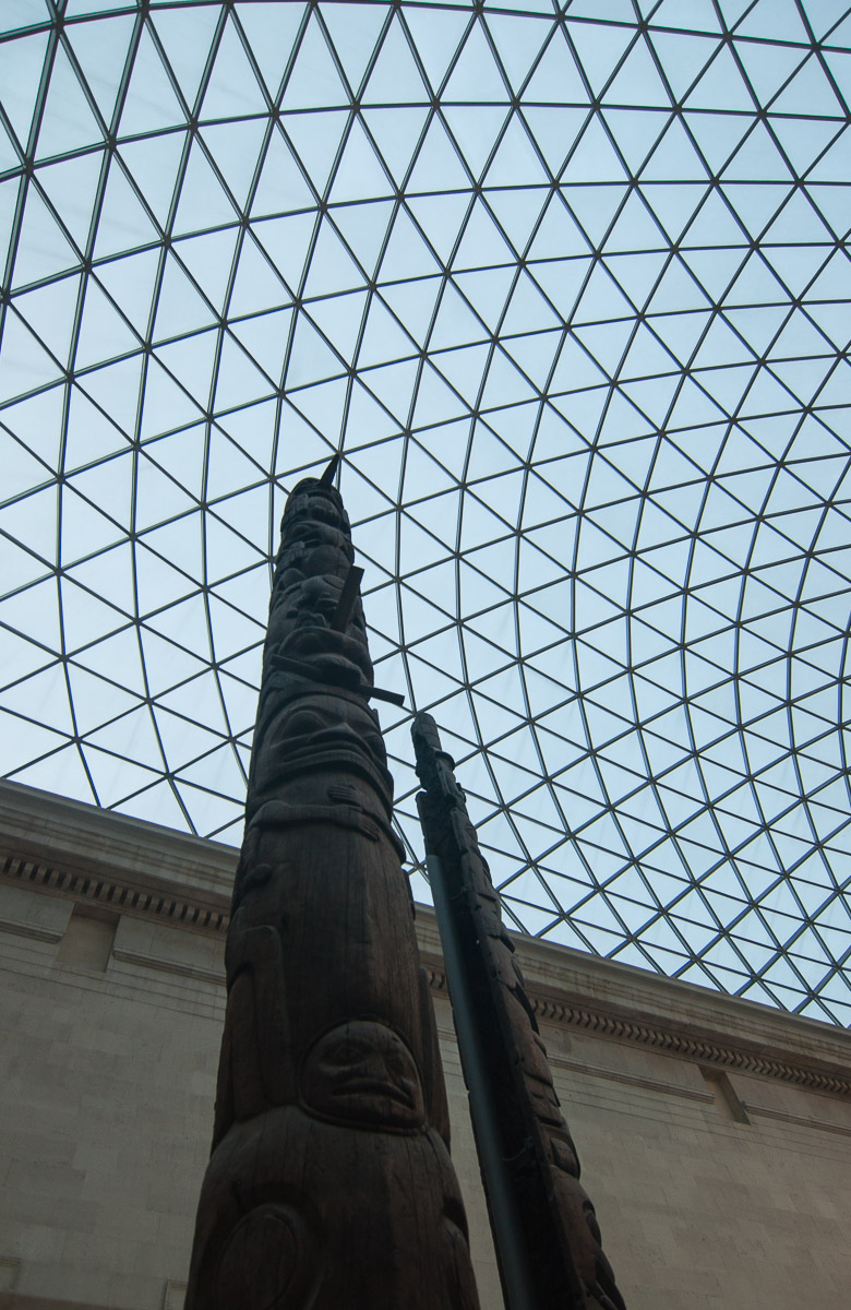 Un totem de la tribu india Haida, en Canadá, comparte espacio en el patio central del museo con esculturas romanas, griegas o egípcias