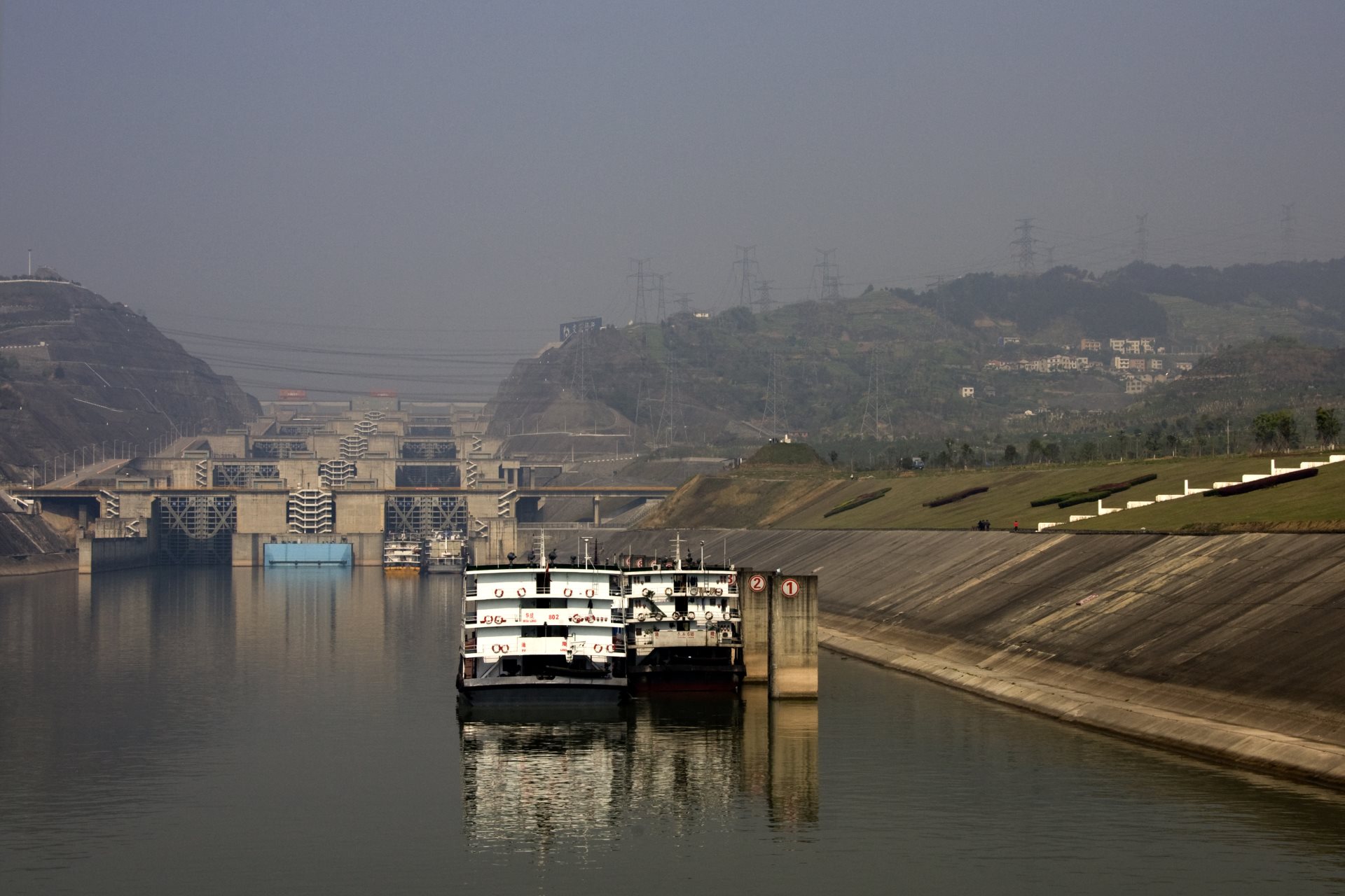 Hacen falta cuatro horas para que los barcos puedan pasar por los dos grupos de cinco esclusas de la presa, que permitieron facilitar la navegación del río desde Shanghái a Chongqing. Está en construcción un ascensor para buques, que recortaría ese tiempo a entre 30 y 40 minutos.