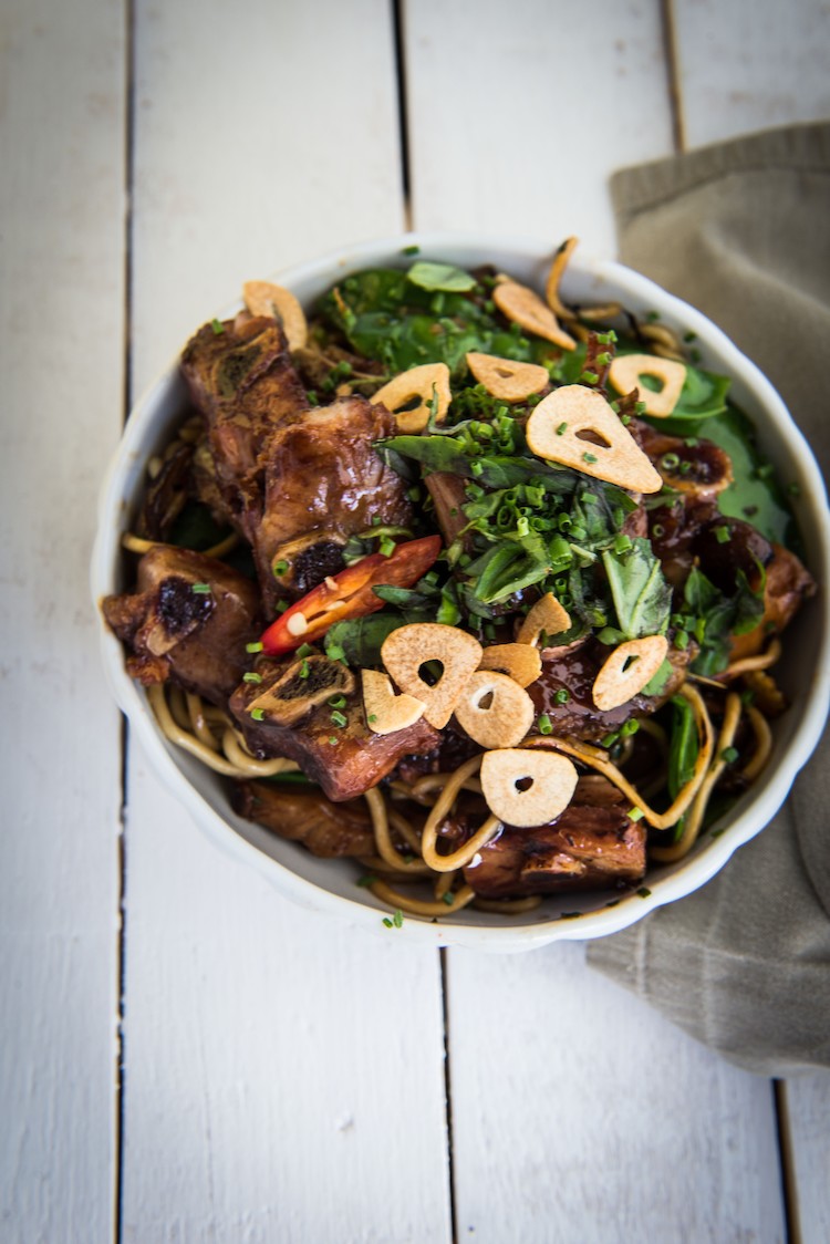 O esta deliciosa ensalada con costillas de cerdo y chips de ajo.