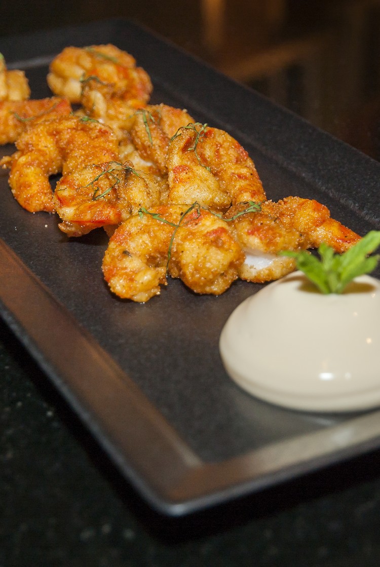 La carta también ofrece la posibilidad de optar por las ‘Raciones en Frío’: ensalada César, sardinas marinadas con aceite de tomate seco y orégano fresco, salpicón de buey de mar y bogavante... Y dos sopas: dashi de tomates asados, con tofu y espinacas salteadas y la crema de setas, buñuelos de berenjena y yogurt al comino.. En la imagen, langostinos fritos al curry y menta.